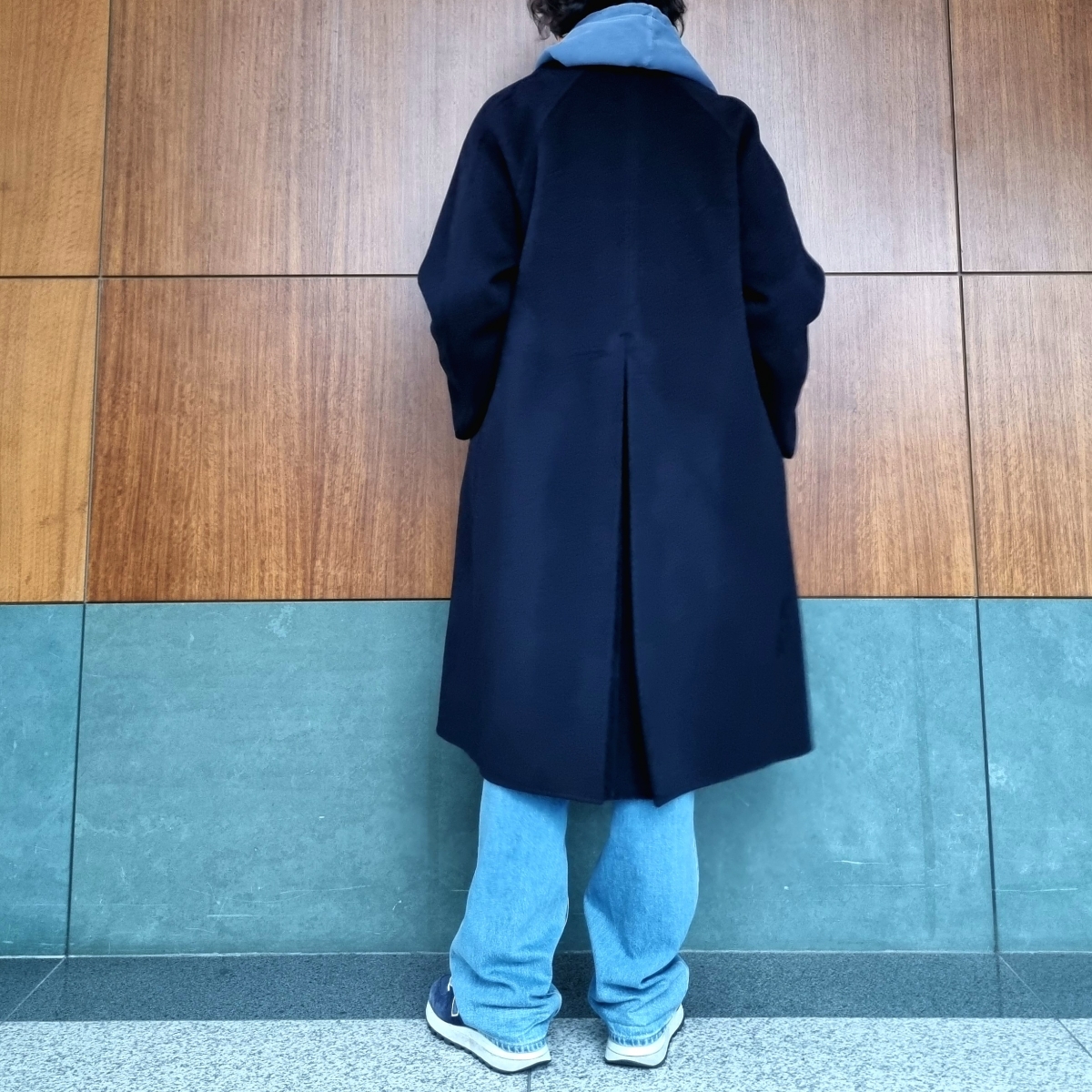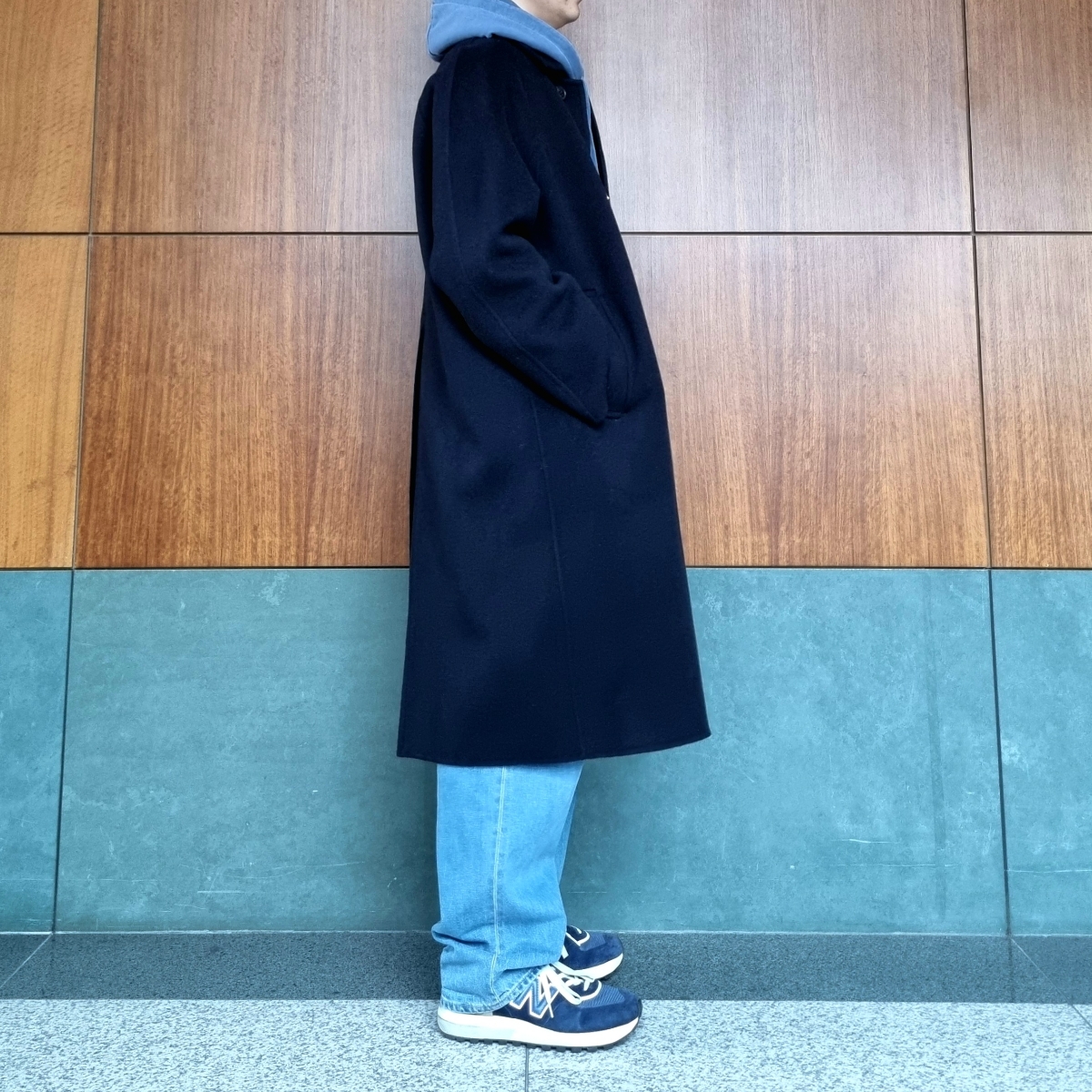 전체적으로 안에는 밝은 블루 계열로 입어주고 발마칸 롱코트를 걸쳤다. 코트가 블랙인가 네이비 인가 혼동될 정도로 다크한 네이비인데 진짜 검은색 옆에 있어야 블루끼가 보인다.